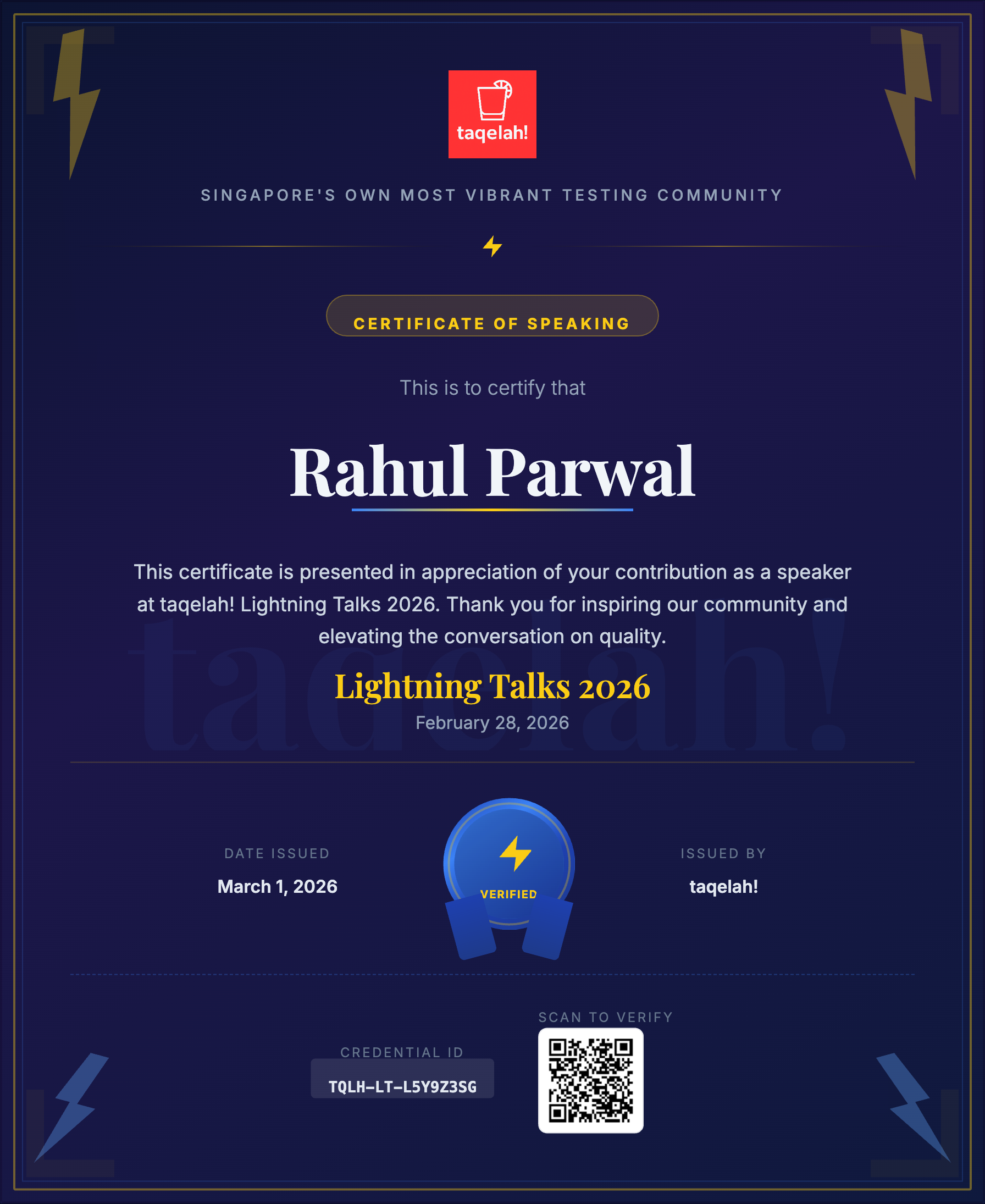 Awards, Contest wins & Testimonials Awards EuroSTAR 2025 Best Tutorial WinnerJerry Weinberg testing excellence award 2021Ministry of Testing community certified 2024Xmind Ambasaddor 2026Best Session Award - ifm engineering (Testing Conference)Taqelah ⚡Talks - SpeakerConfQ - SpeakerSPARKS Conference SpeakerLambdaTest Spartan 2025BrowserStack Champion 2023Best Auditee - QMS @ ifmFinalist of Rising Star Award 2022Champs @ ifm 2025 WinnerWinner - Super voice 2022Customer Choice Award 2025 - ifm engineering Previous Next Contest wins 1st position Cignithon 2021 1st position ACCELQ Hackathon 2.0 2021 3rd position ACCELQ Hackathon 1.0 20211st position Cignithon 20223rd position Moolympics 2.0 20213rd position Molympics 3.0 2021 3rd position Super Reads 2021 3rd position Virtuoso Hackathon 20211st position ZenQuest 2021Test innovation challange 20225th position UI Path hackathon Previous Next Testimonials Previous Next Recommendations Guest Trainer - Gen AI Workshop for Lodgify
