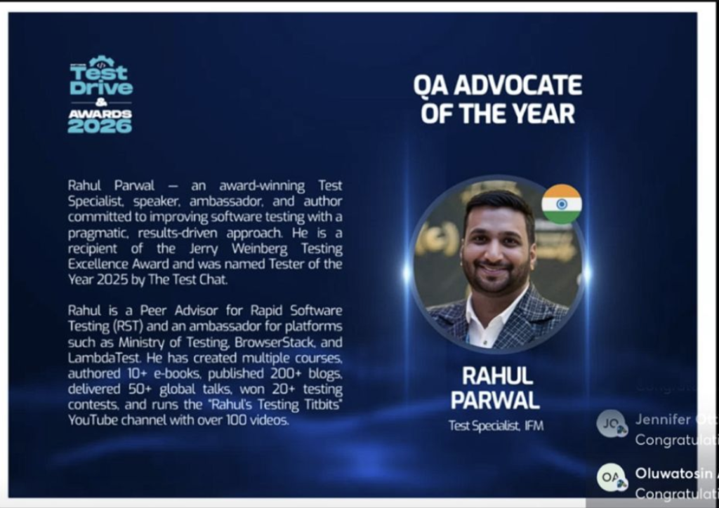 TrulyΒ joyful to have shared the finalist list with incredible folks like Callum Akehurst-Ryan, Nicola Lindgren, and with legends like James Bach. I consider myself a student of James, the biggest QA advocate in my book, and being recognized as a QA Advocate alongside him means a great deal.